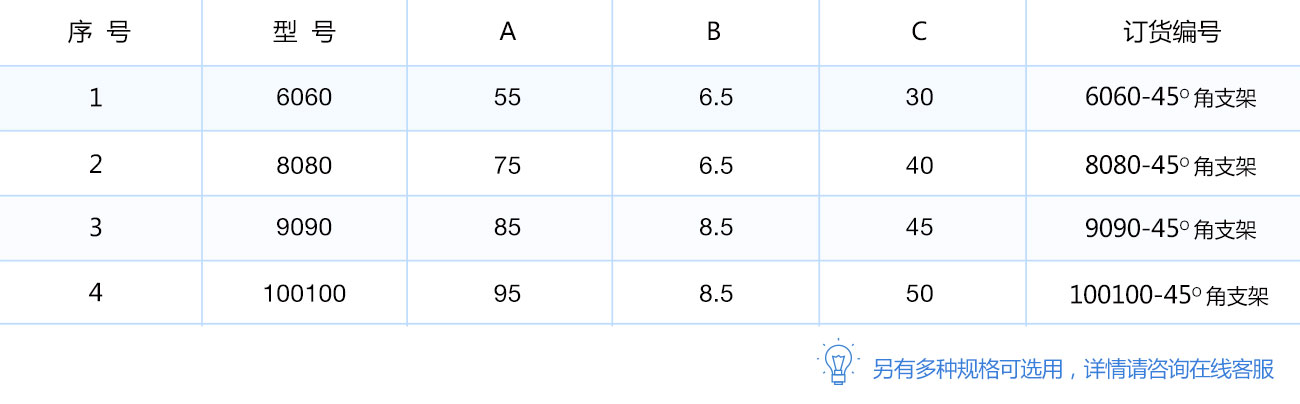45度支架是從擠壓型材上截取料段,經(jīng)鉆孔加工而成。表面銀白陽極氧化(端面未氧化),連接強度高。靈活性和通用性能好,安裝簡單方便。主要用于型材的45度角連接。